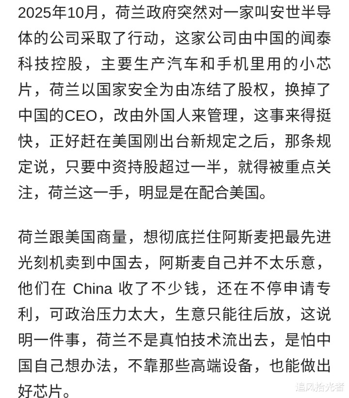 荷兰政府最近干了件让中国网友直呼"太离谱"的事,直接冻结了中国闻泰科技旗下的安世半导体资产。闻泰董事长张学政被暂停所有职务,公司被"接管",这下可好,闻泰直接"社死"了。