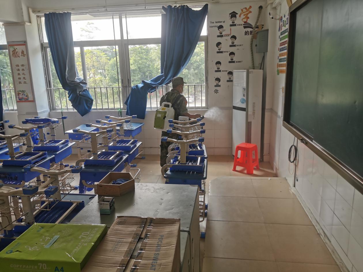 消杀现场,身着迷彩服的民兵和退役军人志愿者分工明确、配合默契。他们背着沉重的消毒设备,严格按照防疫消杀操作规范,对教室、办公室、食堂、宿舍、走廊、操场等校园各个区域进行细致喷洒消毒,不放过任何一个角落,确保消杀全面覆盖、不留盲区。
