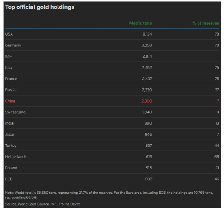 各大央行的黄金持有量