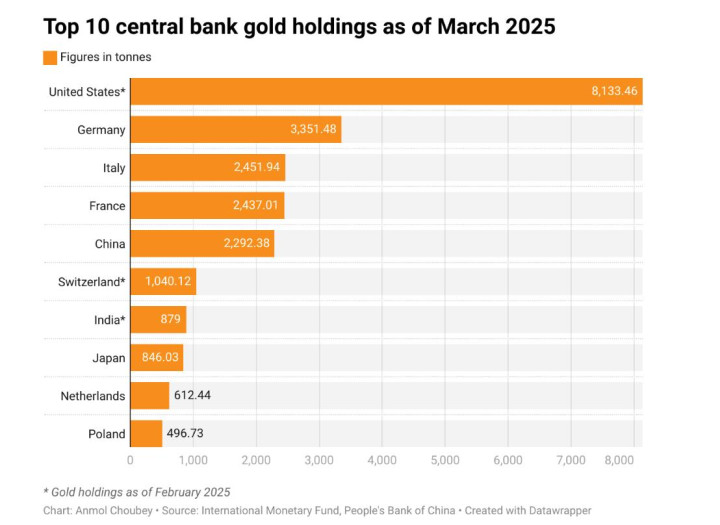 截至2025年2月,黄金持有量最高的十大央行